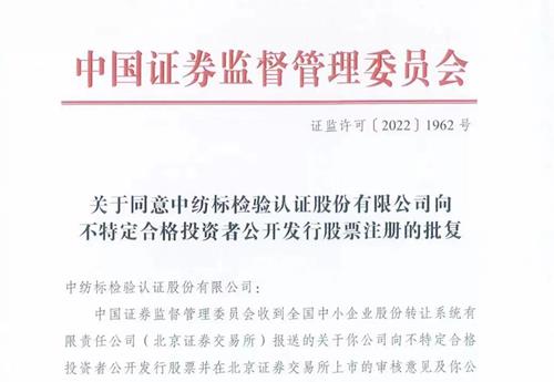 8月31日,據北京證券交易所官網公告,中國證監會同意中紡標檢驗認證股份有限公司向不特定合格投資者公開發行股票的注冊申請。這意味著,中紡標登陸北交所再進一步,將在近期啟動股票發行。