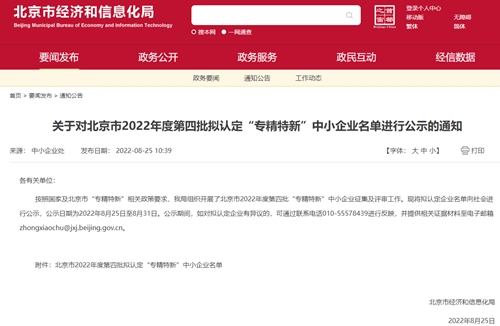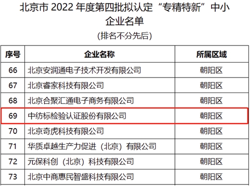 中紡標上榜北京市2022年度"專精特新"中小企業(yè)公示名單
