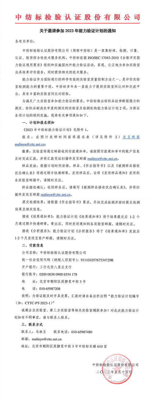 能力驗證作為國際通行的科學有效的實驗室質量控制方法之一,是評價實驗室檢測能力的重要手段。通用技術中紡院中紡標檢驗認證股份有限公司(以下簡稱“中紡標”)多年來一直致力于提供實驗室間比對和交流平臺,具有豐富的實驗室間比對經驗。中紡標依據ISO/IEC 17043-2010《合格評定能力驗證通用要求》組織和實施國內外能力驗證活動,客觀、公正地為參加實驗室出具結果評價報告,同時提供相關的技術服務。中紡標已啟動2023年能力驗證計劃。誠邀企業實驗室、第三方實驗室等相關實驗室踴躍參加!