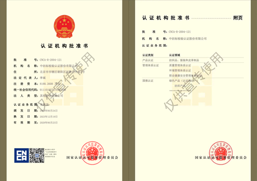 近日,通用技術中紡標檢驗認證股份有限公司(以下簡稱“中紡標”)收到國家認證認可監督管理委員會換發的認證機構批準書,批準擴增質量管理體系、環境管理體系、職業健康安全管理體系等認證能力。